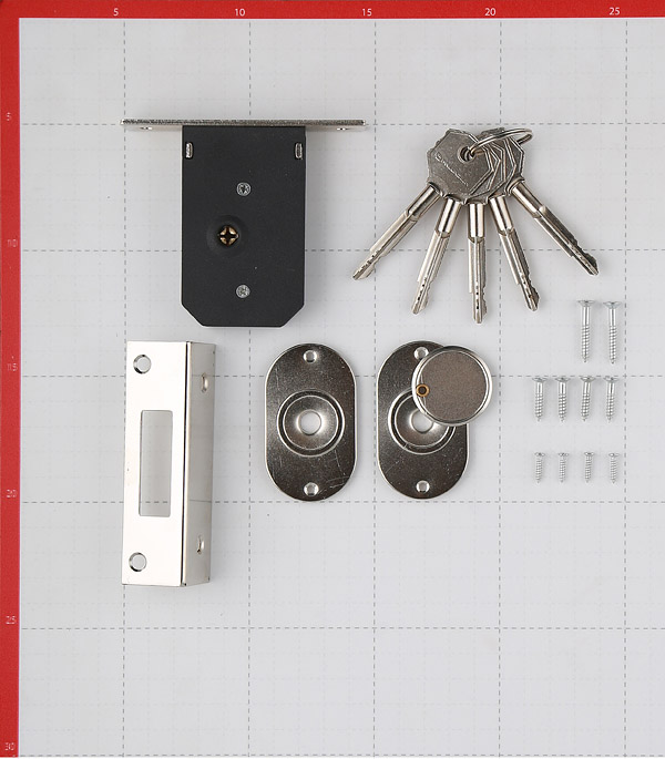 замок, ответная планка, декоративные накладки на ключевое отверстие, шурупы, 5 ключей.