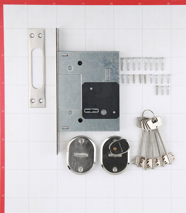 замок, ответная планка, декоративная накладка на ключевое отверстие, шурупы, 5 сувальдных ключей с двойной бородкой.