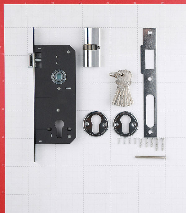 замок, цилиндр 35х35 мм, ответная планка, декоративная накладка на цилиндровый механизм, шурупы, 5 перфорированных латунных ключей.