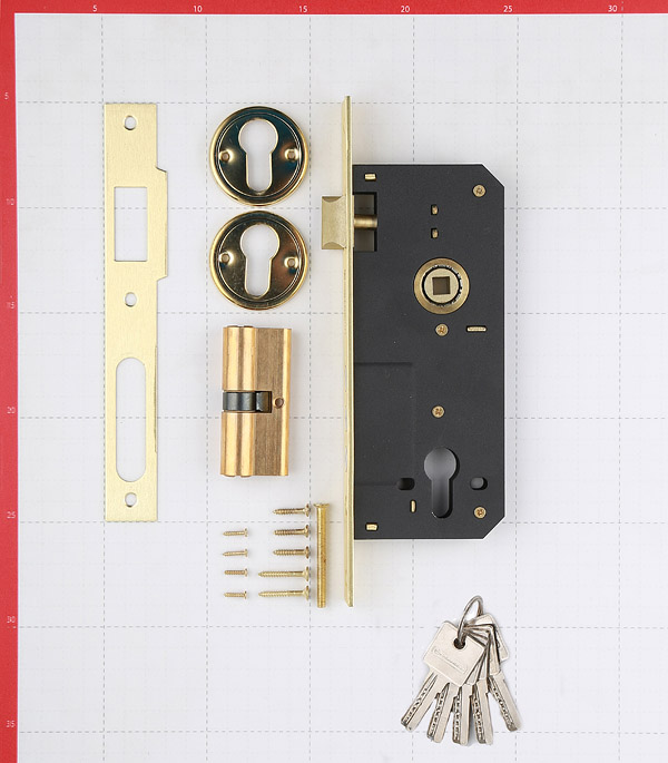 замок, цилиндр 35х35 мм, ответная планка, декоративная накладка на цилиндровый механизм, шурупы, 5 перфорированных латунных ключей.
