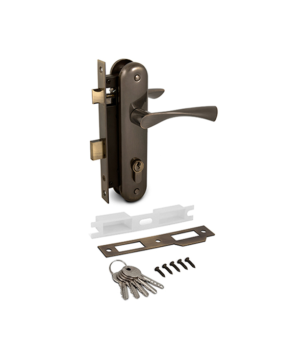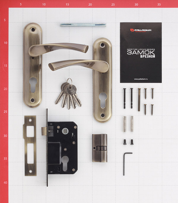 замок врезной, 2 ручки на планке, цилиндровый механизм 5 пинов, ответная планка, пластиковая вставка под ответную планку, квадрат, стяжные винты для крепления ручек, шурупы в цвет планки, 5 английских ключей.