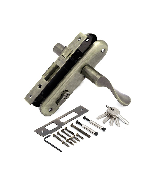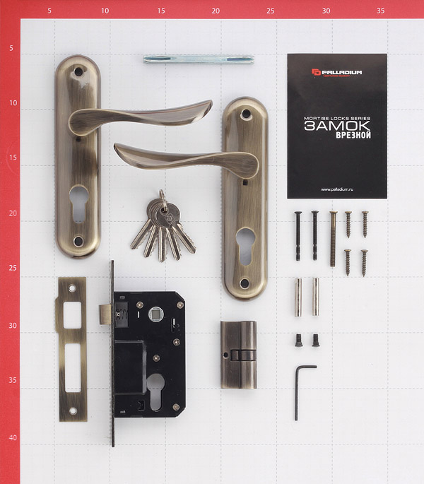 замок врезной, 2 ручки на планке, цилиндровый механизм 5 пинов, ответная планка, квадрат, стяжные винты для крепления ручек, шурупы в цвет планки, 5 английских ключей.