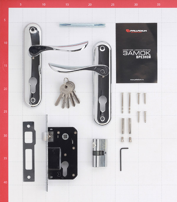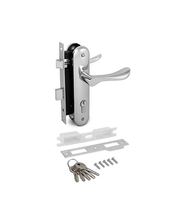 замок врезной, 2 ручки на планке, цилиндровый механизм 5 пинов, ответная планка, пластиковая вставка под ответную планку, квадрат, стяжные винты для крепления ручек, шурупы в цвет планки, 5 английских ключей.