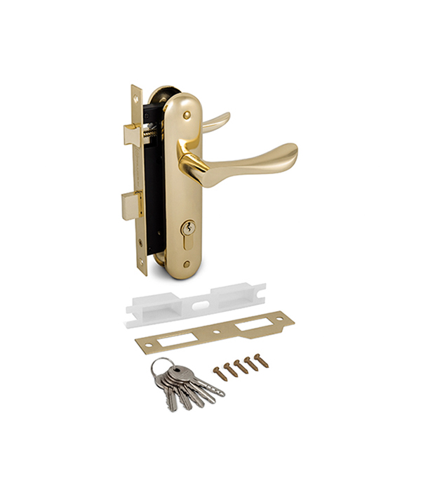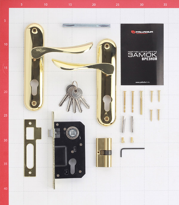 замок врезной, 2 ручки на планке, цилиндровый механизм 5 пинов, ответная планка, пластиковая вставка под ответную планку, квадрат, стяжные винты для крепления ручек, шурупы в цвет планки, 5 английских ключей.
