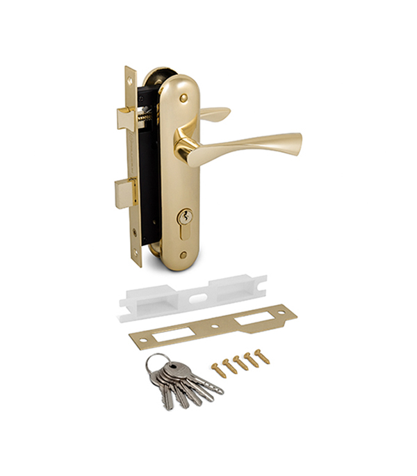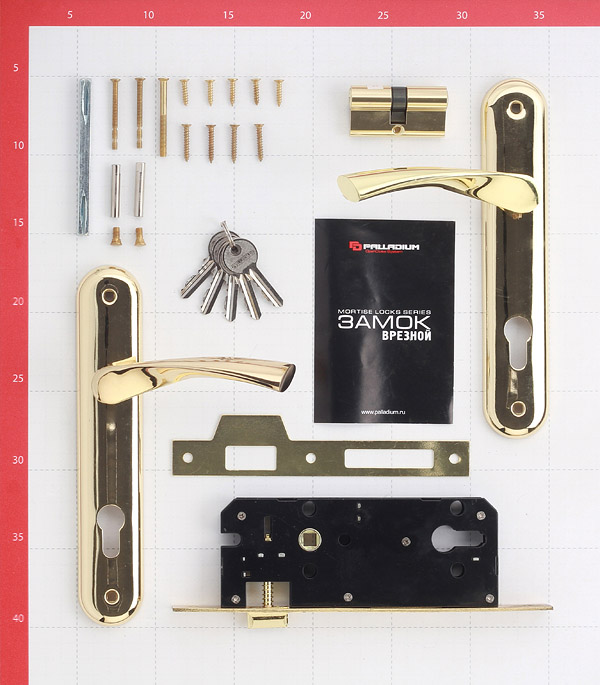 замок врезной, 2 ручки на планке, цилиндровый механизм 5 пинов, ответная планка, пластиковая вставка под ответную планку, квадрат, стяжные винты для крепления ручек, шурупы в цвет планки, 5 английских ключей.