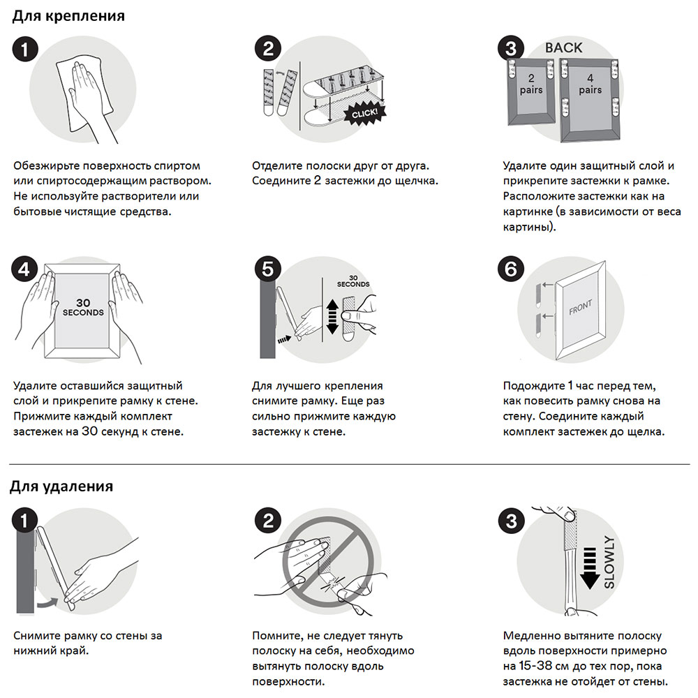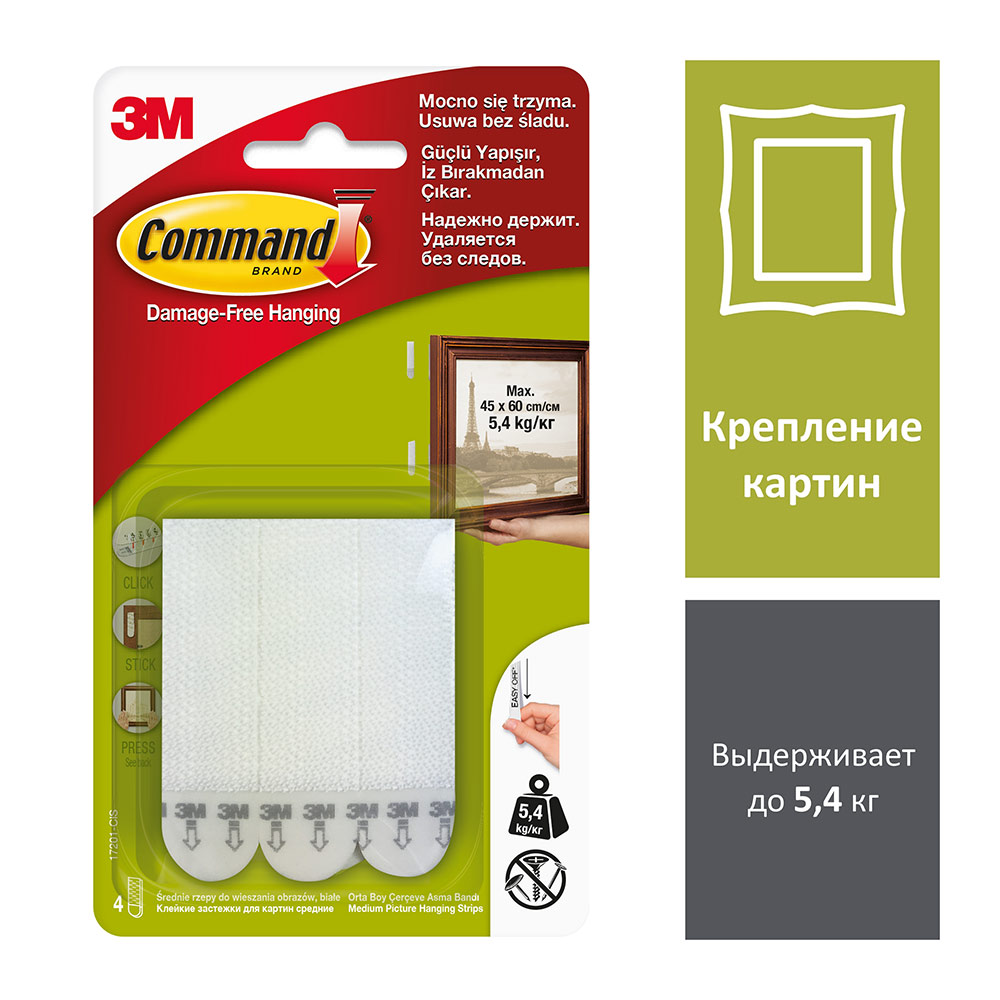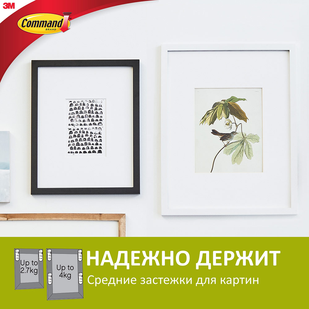 Command™ не повреждает поверхности, надежно держит и удаляется без следа.rnЛегко крепить, не нужно сверлить стены и использовать механический крепеж. rnПолоска легко растягивается и удаляется, не оставляя отверстий, повреждений и следов клея. rnПодходит для гладких поверхностей, включая окрашенные стены, плитку, металл, обработанное дерево, пластик. rnЗастежки следует размещать так, чтобы они были полностью скрыты рамкой. rnЗастежки соединяются и разъединяются, так что можно легко снять и перевесить картину в другое место (потребуются лишь дополнительные ответные застежки для стены). rnМаксимальная нагрузка – 5,4 кг. 1 пара выдерживает до 1,3 кг. Упаковка содержит 4 пары.