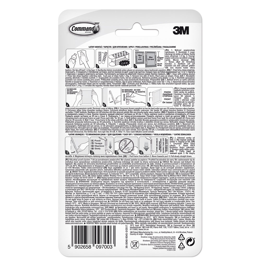 Застежки для картин Command™ – это инновационное решение для крепления картин, постеров и фотографий в раме. Застежки надежно держат и легко снимаются благодаря технологии 3M Stretch-Release.rnС помощью застежек Command™ можно быстро и легко украсить интерьер. А когда вы снова будете готовы к переменам, их можно легко снять, не повреждая поверхности. Никаких отверстий, повреждений краски или следов клея. Возможности декорирования безграничны! Идеально подходят для съемного жилья, если вы не хотели бы повреждать стены. Средние полоски подойдут для большинства рамок размером до 45 см х 60 см.