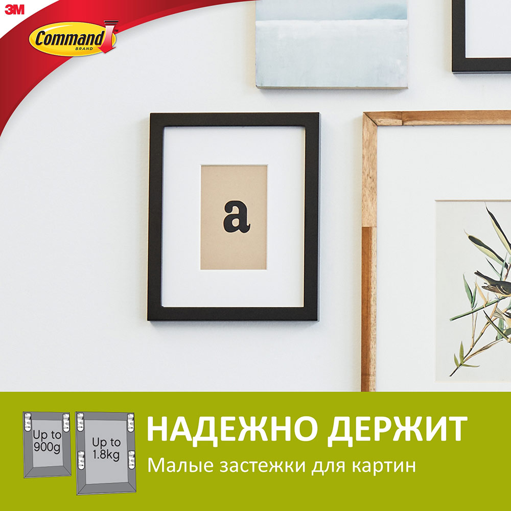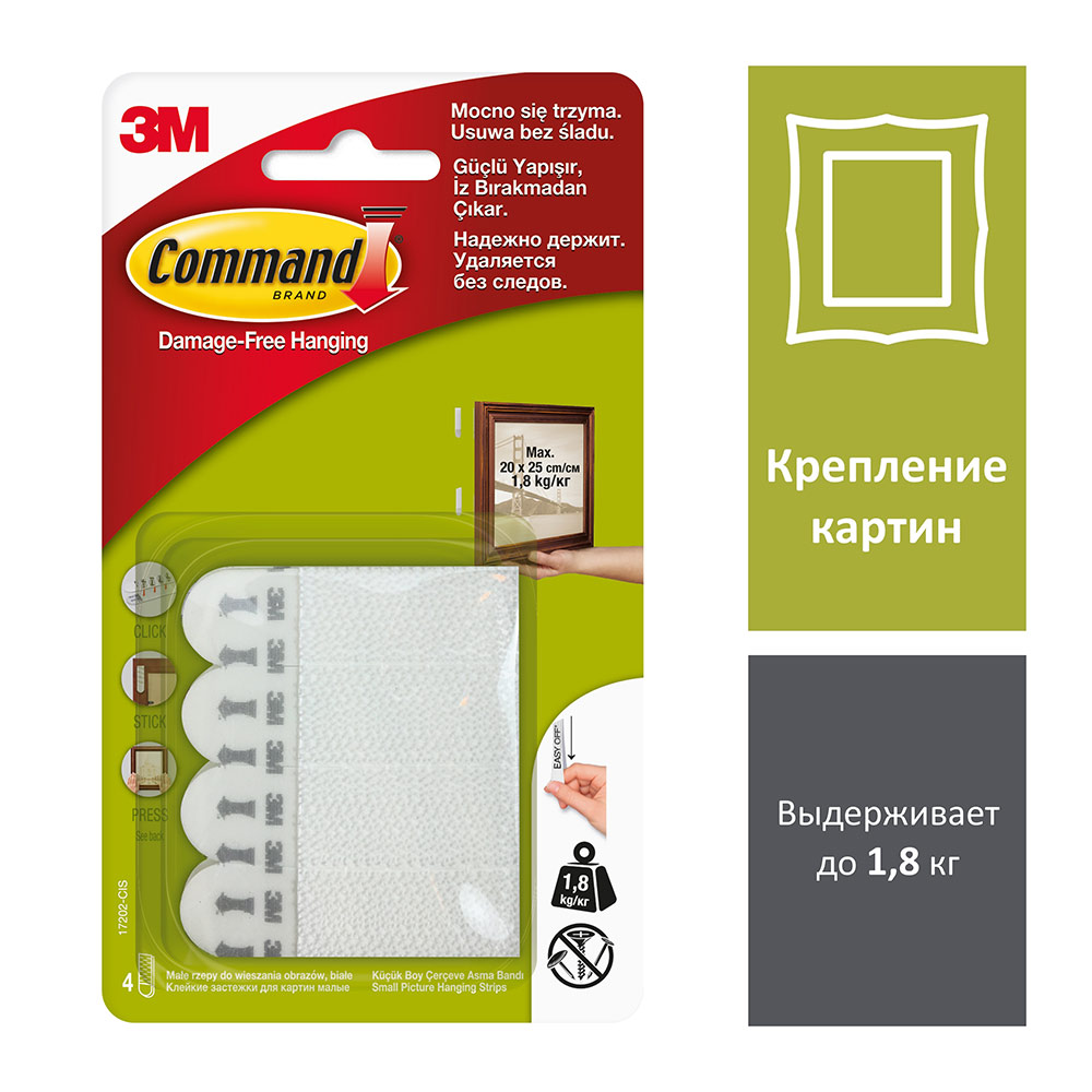 Command™ не повреждает поверхности, надежно держит и удаляется без следа. rnЛегко крепить, не нужно сверлить стены и использовать механический крепеж. rnПолоска легко растягивается и удаляется, не оставляя отверстий, повреждений и следов клея. rnПодходит для гладких поверхностей, включая окрашенные стены, плитку, металл, обработанное дерево, пластик. rnЗастежки следует размещать так, чтобы они были полностью скрыты рамкой. rnЗастежки соединяются и разъединяются, так что можно легко снять и перевесить картину в другое место (потребуются лишь дополнительные ответные застежки для стены).rnМаксимальная нагрузка – 1,8 кг. 1 пара выдерживает до 450 г. Упаковка содержит 4 пары.