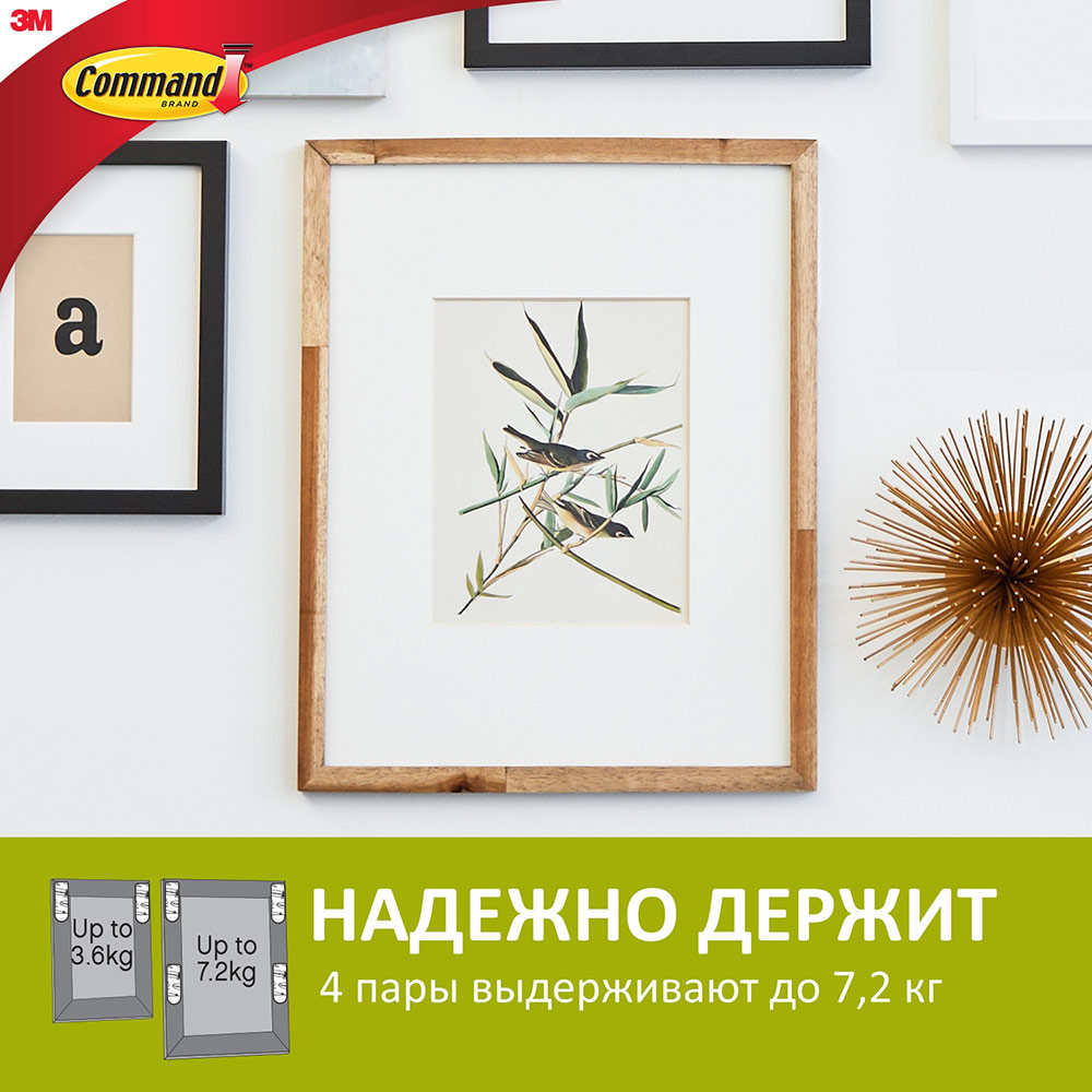 Command™ не повреждает поверхности, надежно держит и удаляется без следа. rnЛегко крепить, не нужно сверлить стены и использовать механический крепеж. rnПолоска легко растягивается и удаляется, не оставляя отверстий, повреждений и следов клея. rnПодходит для гладких поверхностей, включая окрашенные стены, плитку, металл, обработанное дерево, пластик. rnЗастежки следует размещать так, чтобы они были полностью скрыты рамкой. rnЗастежки соединяются и разъединяются, так что можно легко снять и перевесить картину в другое место (потребуются лишь дополнительные ответные застежки для стены). rnМаксимальная нагрузка – 7,2 кг. 1 пара выдерживает до 1,8 г. Упаковка содержит 4 пары.