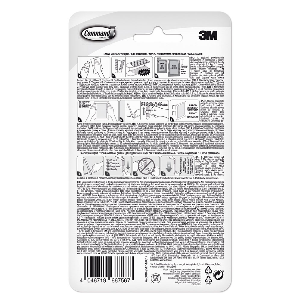 Застежки для картин Command™ – это инновационное решение для крепления картин, постеров и фотографий в раме. Застежки надежно держат и легко снимаются благодаря технологии 3M Stretch-Release.rnС помощью застежек Command™ можно быстро и легко украсить интерьер. А когда вы снова будете готовы к переменам, их можно легко снять, не повреждая поверхности. Никаких отверстий, повреждений краски или следов клея. Возможности декорирования безграничны! Идеально подходят для съемного жилья, если вы не хотели бы повреждать стены. Большие полоски подойдут для большинства рамок размером до 60 см х 90 см.