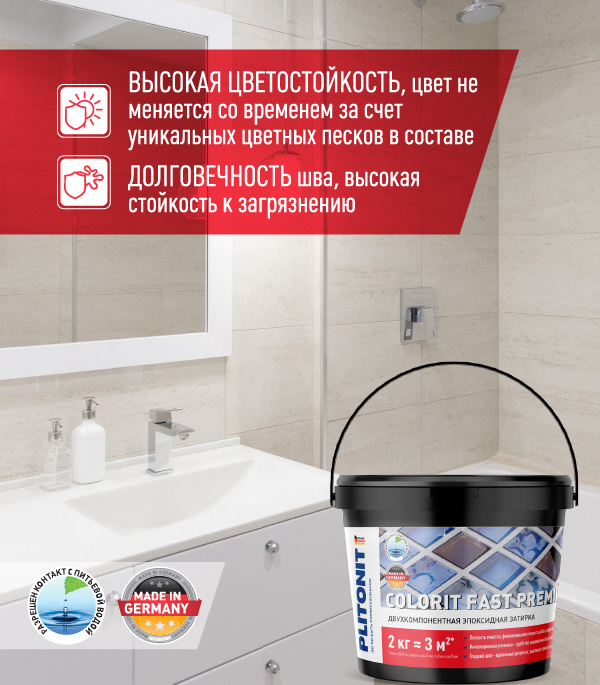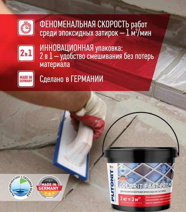 • легкость замывки обеспечивает высокую скорость выполнения работ эпоксидной затиркой Plitonit: 1 м²/мин