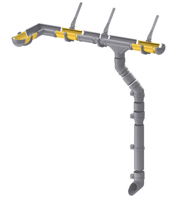 Предназначен для организованного сбора и отвода дождевой воды с поверхности крыши. Элементы просто соединяются друг с другом и легко защелкиваются. При этом каждое соединение трубы или желоба с фитингом являются компенсатором температурного расширения/сжатия.