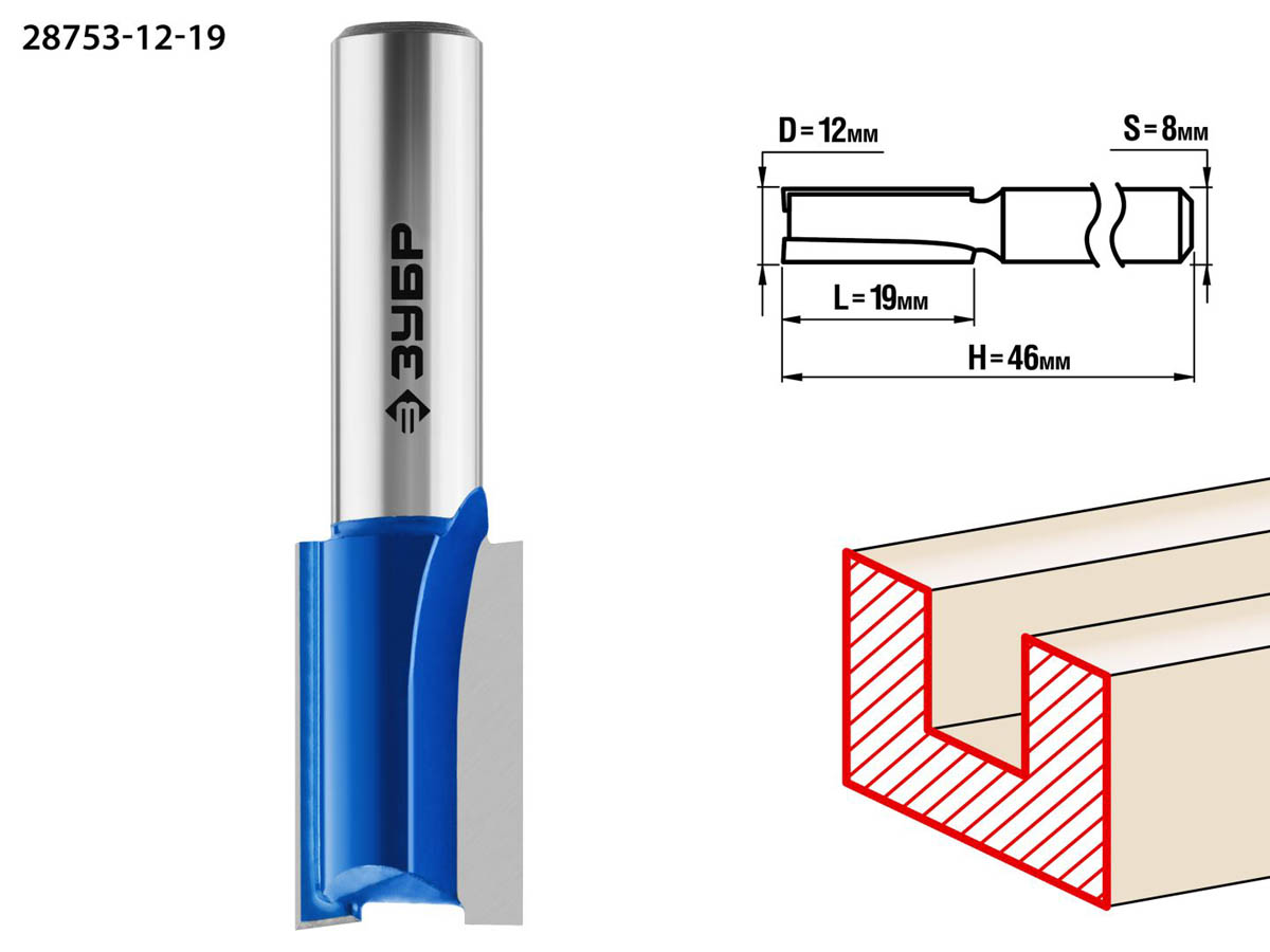 ЗУБР 12 x 19 мм, хвостовик 8 мм, фреза пазовая прямая 28753-12-19 Профессионал