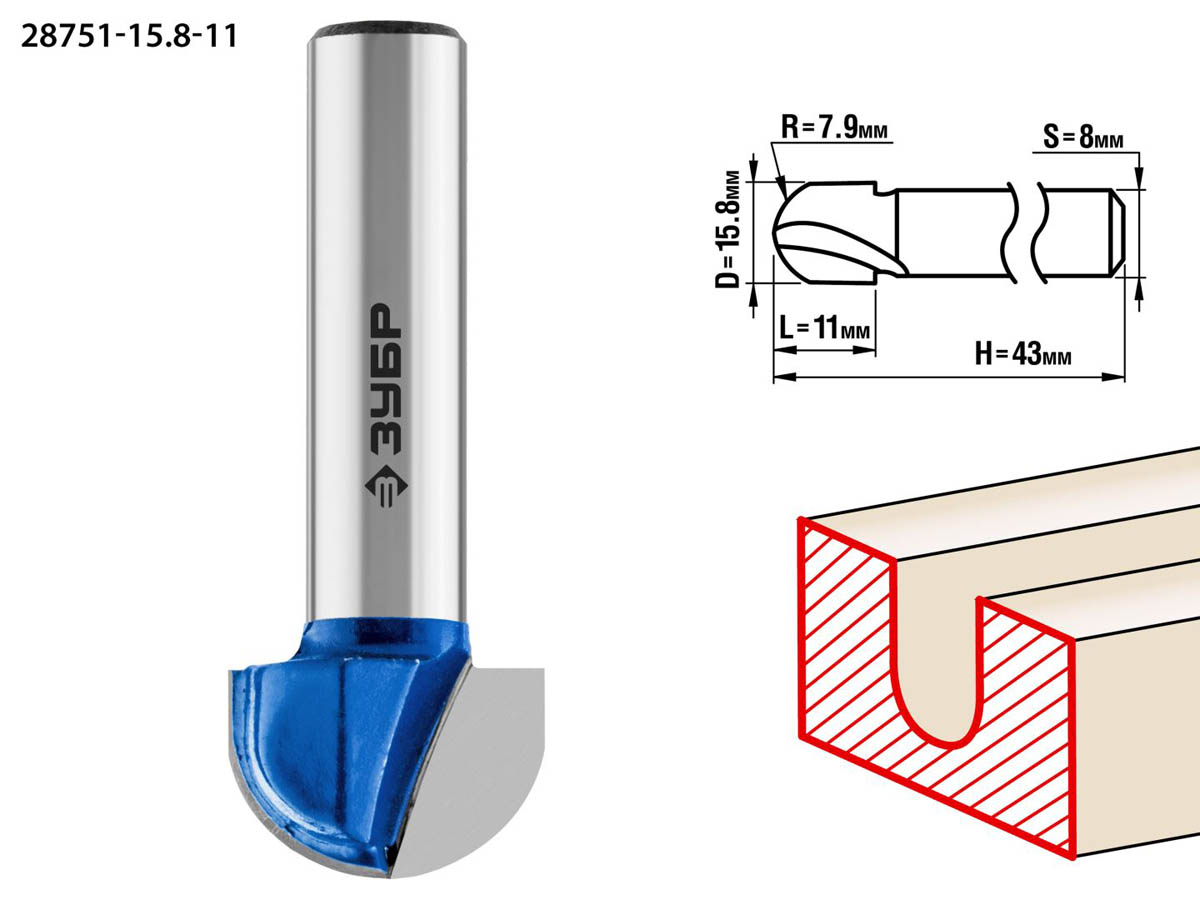 ЗУБР 15.8 x 11 мм, радиус 7.9 мм, фреза пазовая галтельная 28751-15.8-11 Профессионал