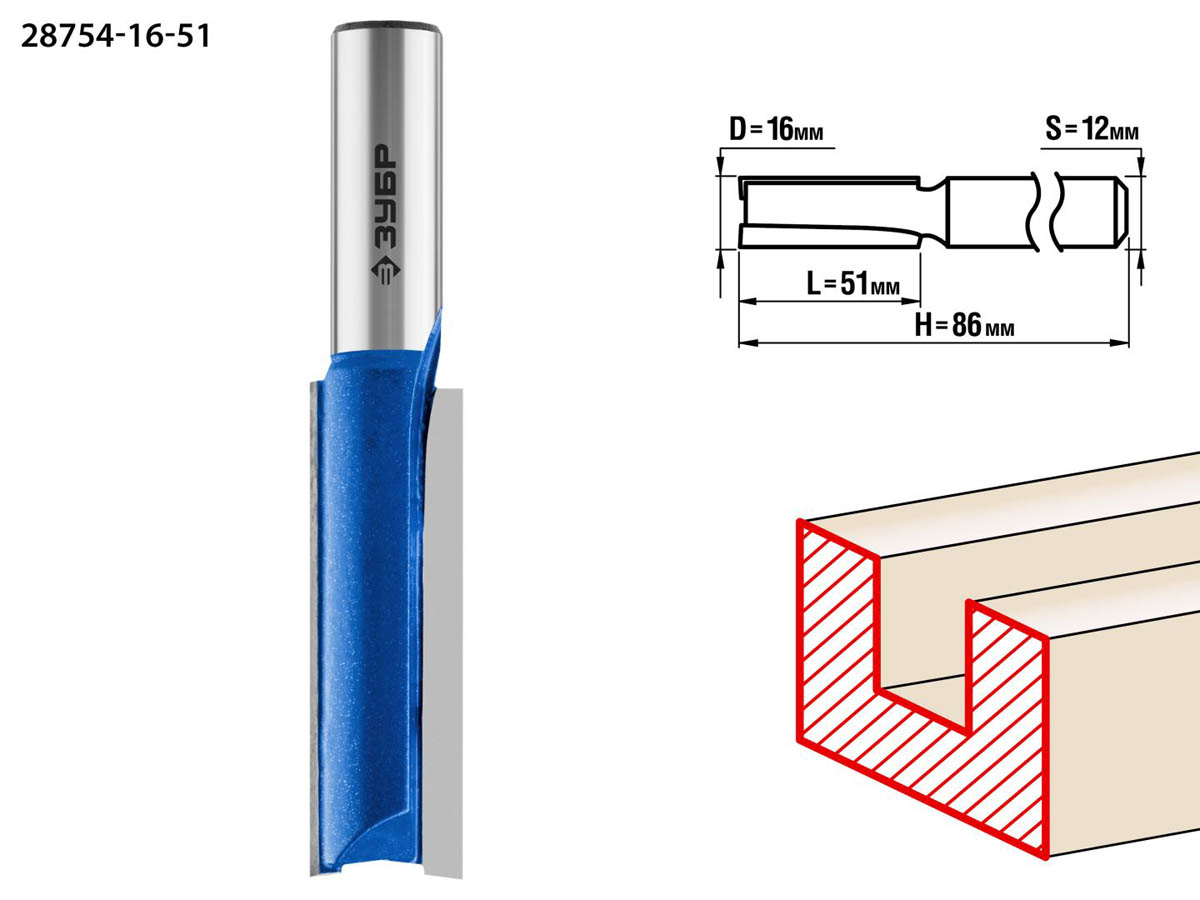 ЗУБР 16 x 51 мм, хвостовик 12 мм, фреза пазовая прямая, удлиненная 28754-16-51 Профессионал