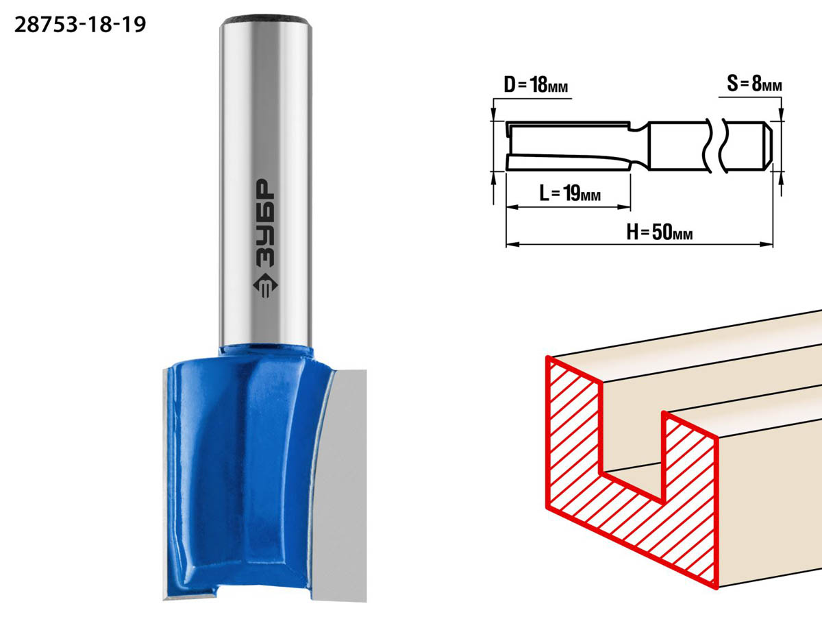 ЗУБР 18 x 19 мм, хвостовик 8 мм, фреза пазовая прямая 28753-18-19 Профессионал