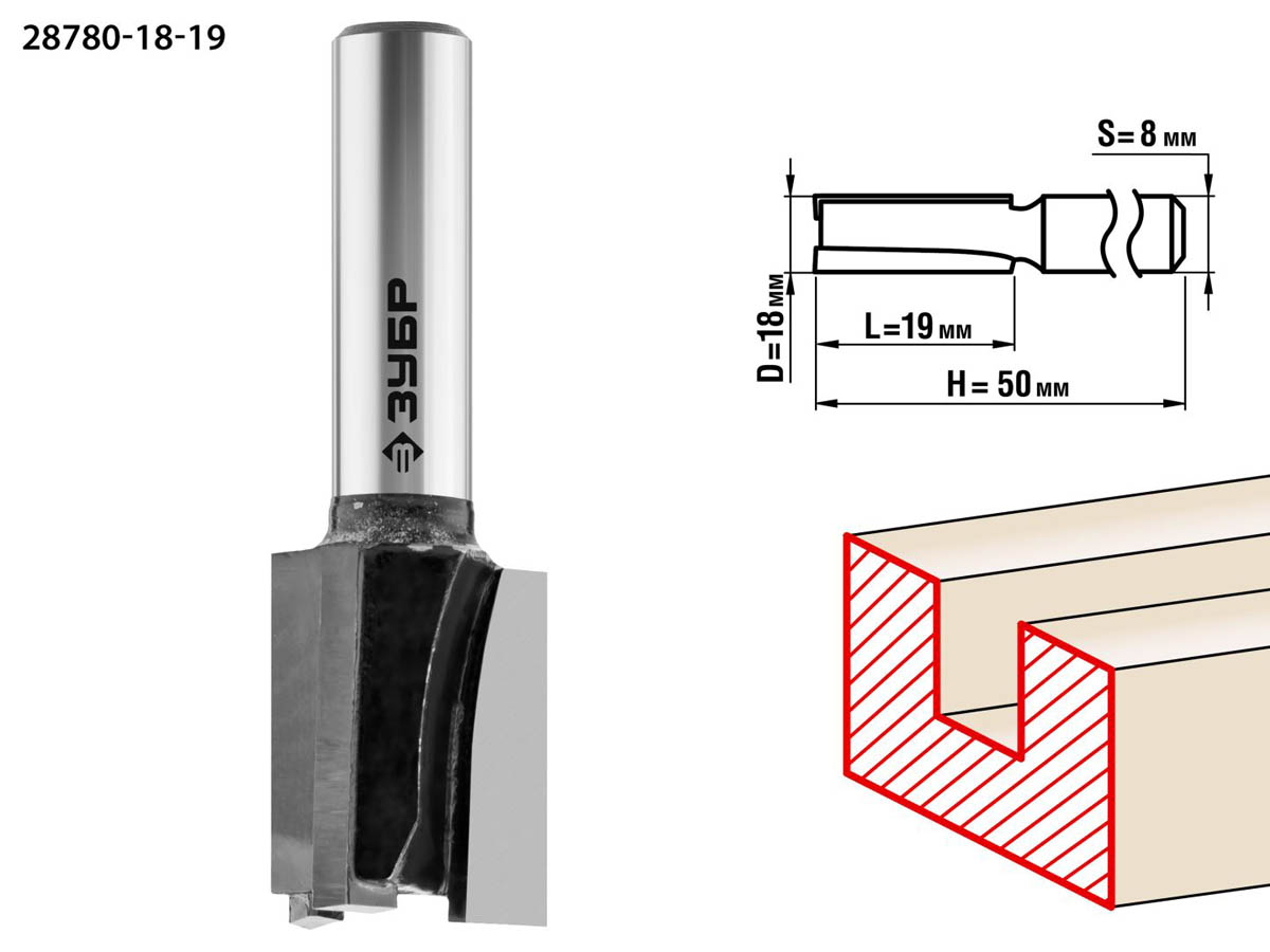 ЗУБР 18 x 19 мм, хвостовик 8 мм, фреза пазовая прямая 28780-18-19 Профессионал