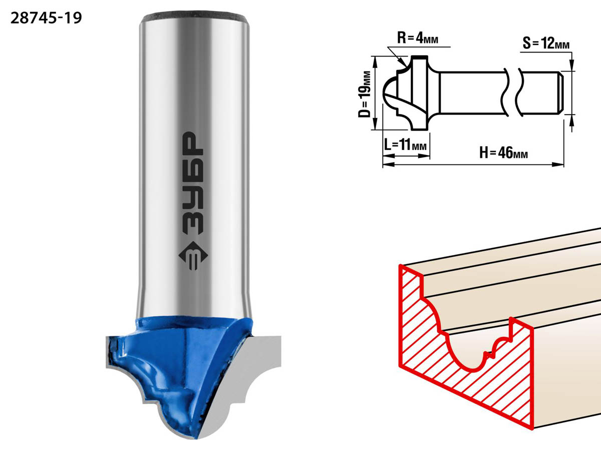 ЗУБР 19 x 11 мм, радиус 4 мм, фреза пазовая фасонная №6 28745-19 Профессионал