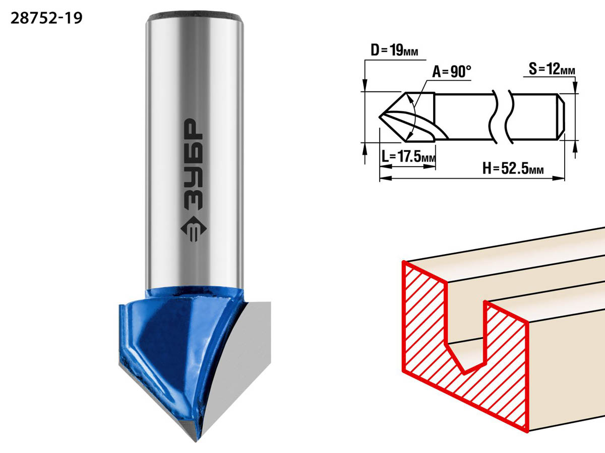 ЗУБР 19 x 17.5 мм, угол 90°, фреза пазовая галтельная V-образная 28752-19 Профессионал
