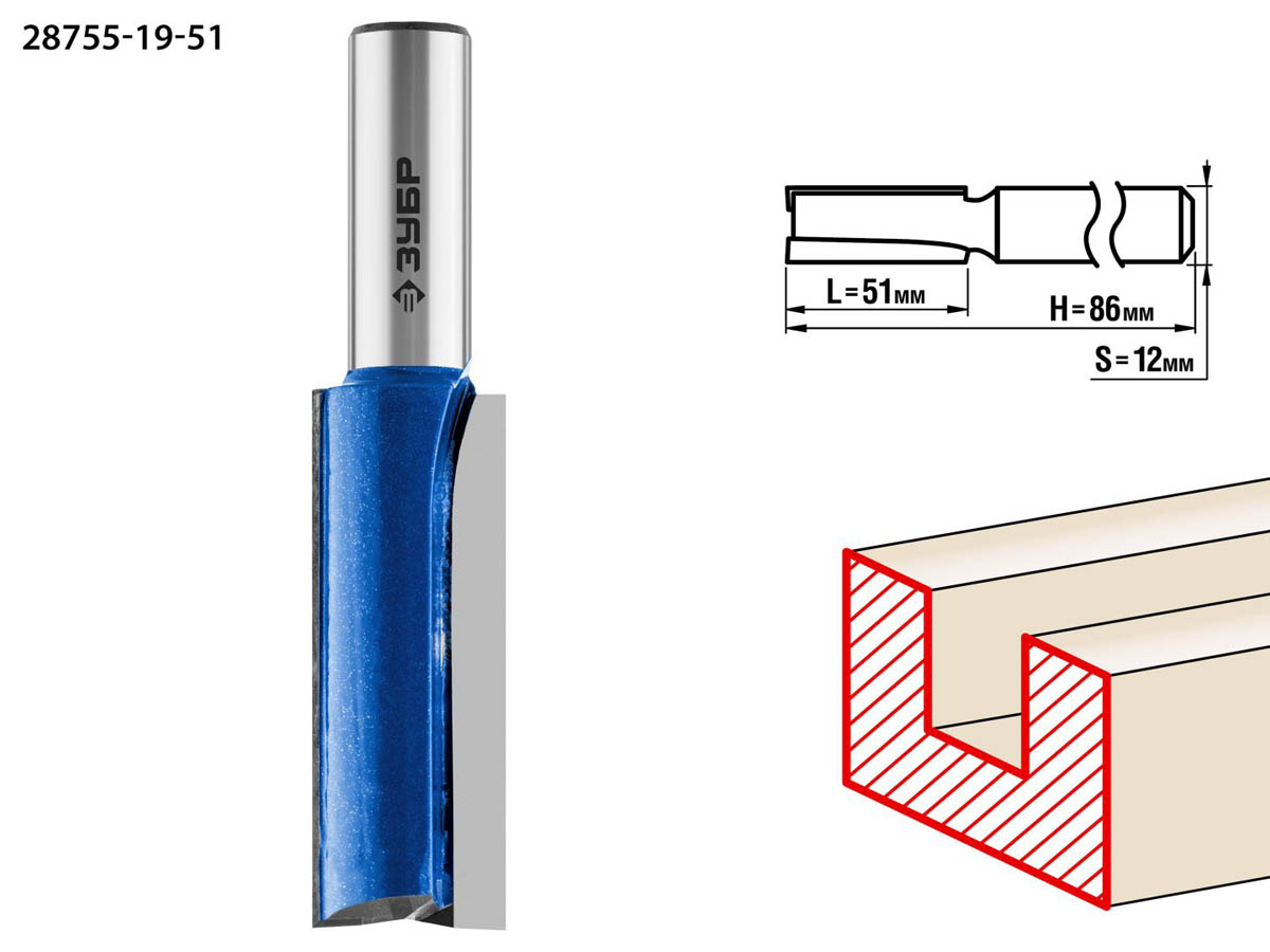 ЗУБР 19 x 51 мм, хвостовик 12 мм, фреза пазовая прямая с нижними подрезателями 28755-19-51 Профессионал