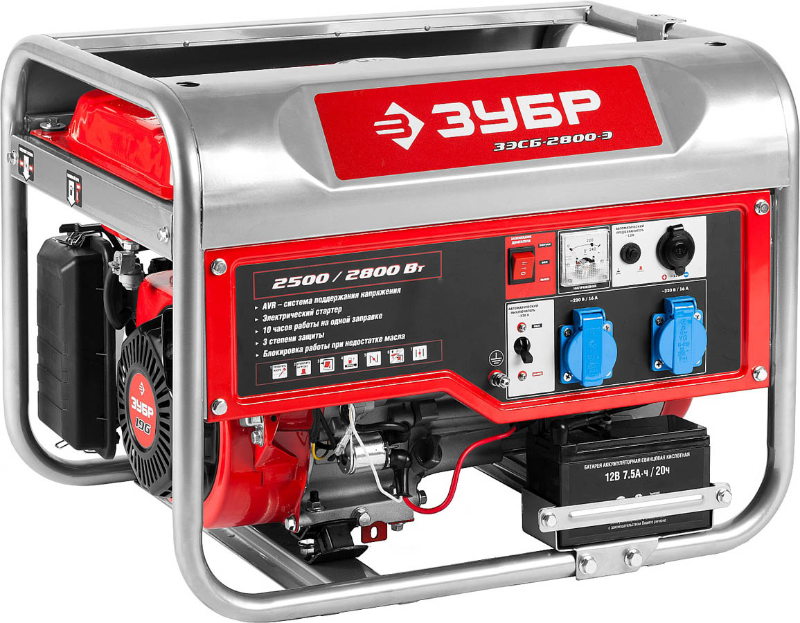 ЗУБР 2.5/2.8 кВт, однофазный, синхронный, щеточный, генератор бензиновый ЗЭСБ-2800-Э