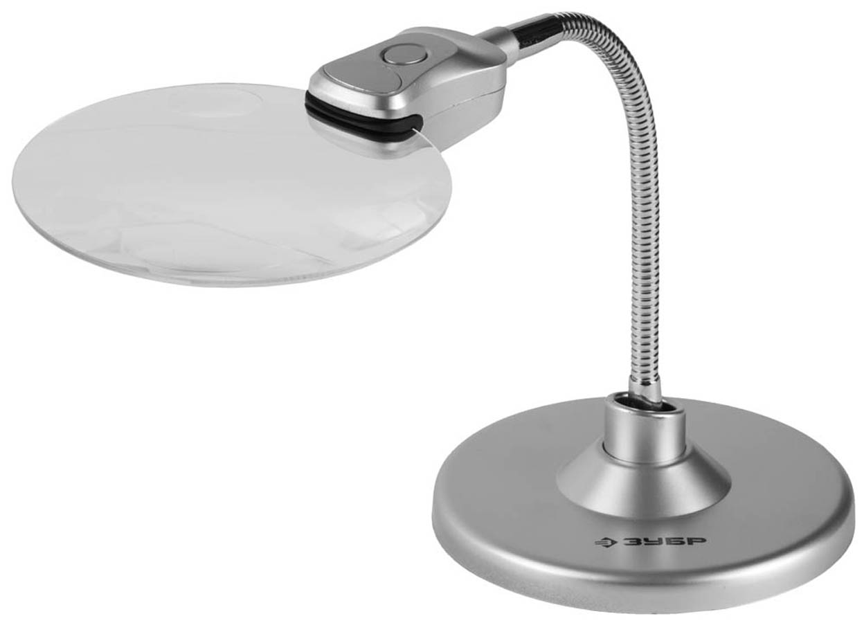 ЗУБР 2/6 кратное увеличение, Ø 110 мм, пластиковая линза, лупа настольная на гибком штативе 40547