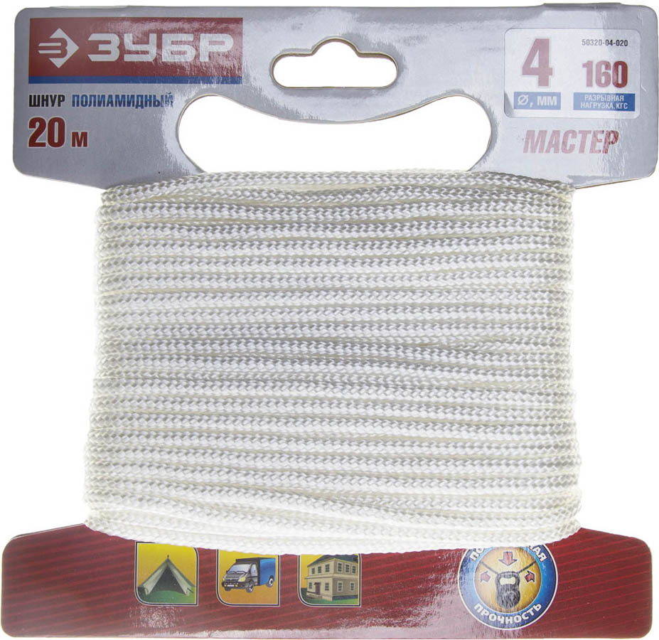 ЗУБР 20 м, 4 мм, плетеный, повышенной нагрузки, без сердечника, белый, шнур полиамидный 50320-04-020