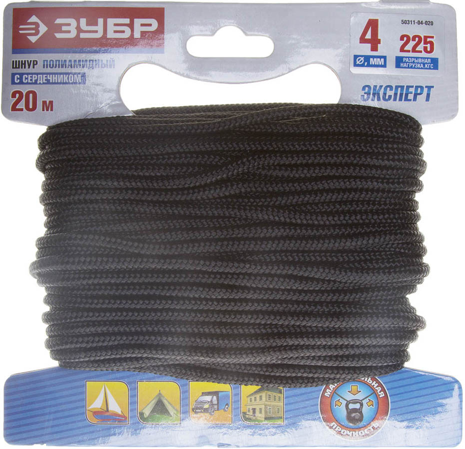 ЗУБР 20 м, 4 мм, плетеный, повышенной нагрузки, с сердечником, черный, шнур полиамидный 50311-04-020