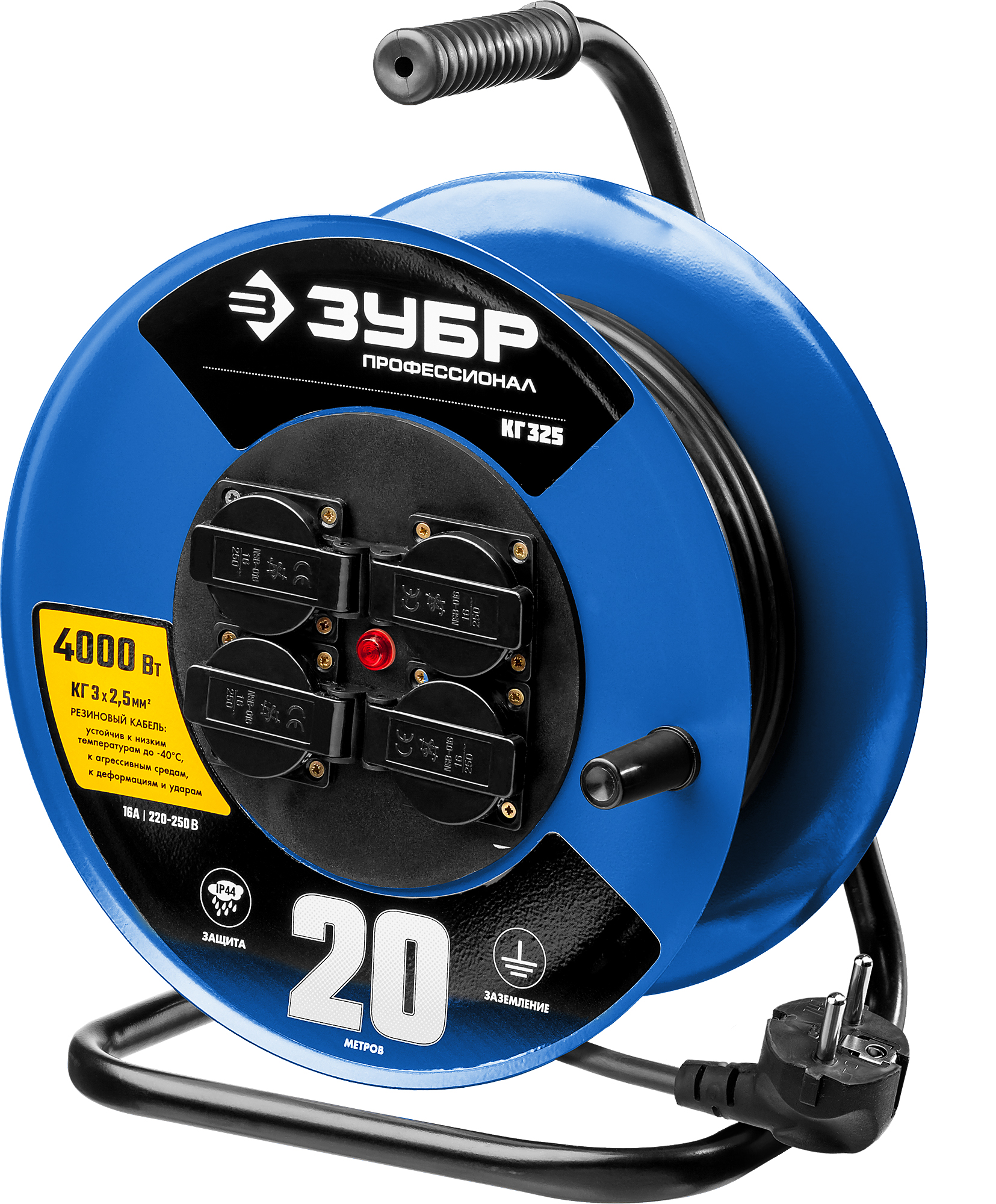 ЗУБР 20 м, 4000Вт, 4 гнезда, КГ, удлинитель на катушке 55079-20 Профессионал