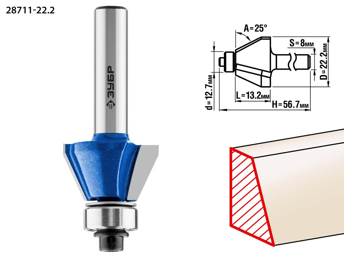 ЗУБР 22.2 x 13.2 мм, угол 25°, фреза кромочная калевочная(фасочная) №9 28711-22.2 Профессионал