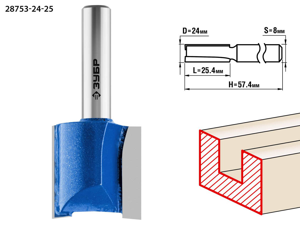 ЗУБР 24 x 25.4 мм, хвостовик 8 мм, фреза пазовая прямая 28753-24-25 Профессионал