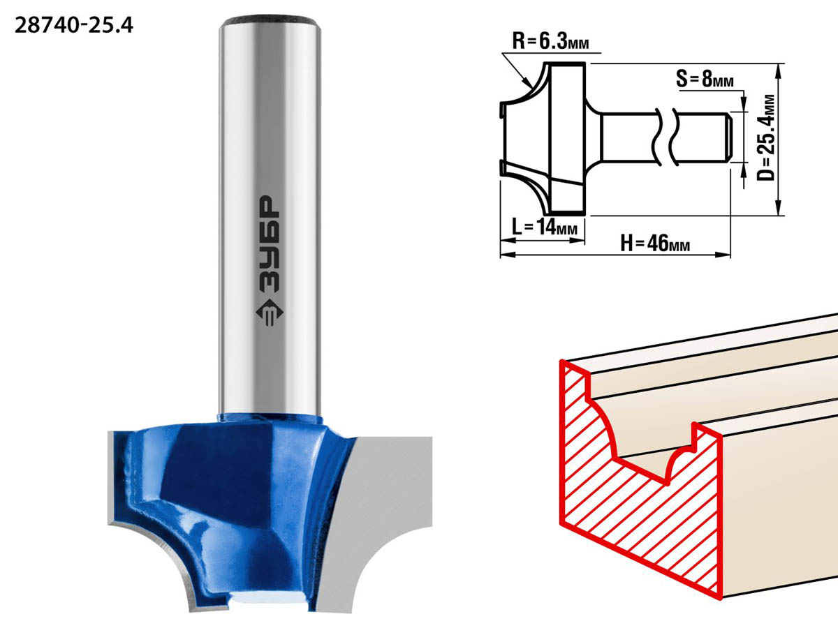 ЗУБР 25.4 x 14 мм, радиус 6.3 мм, фреза пазовая фасонная №1 28740-25.4 Профессионал