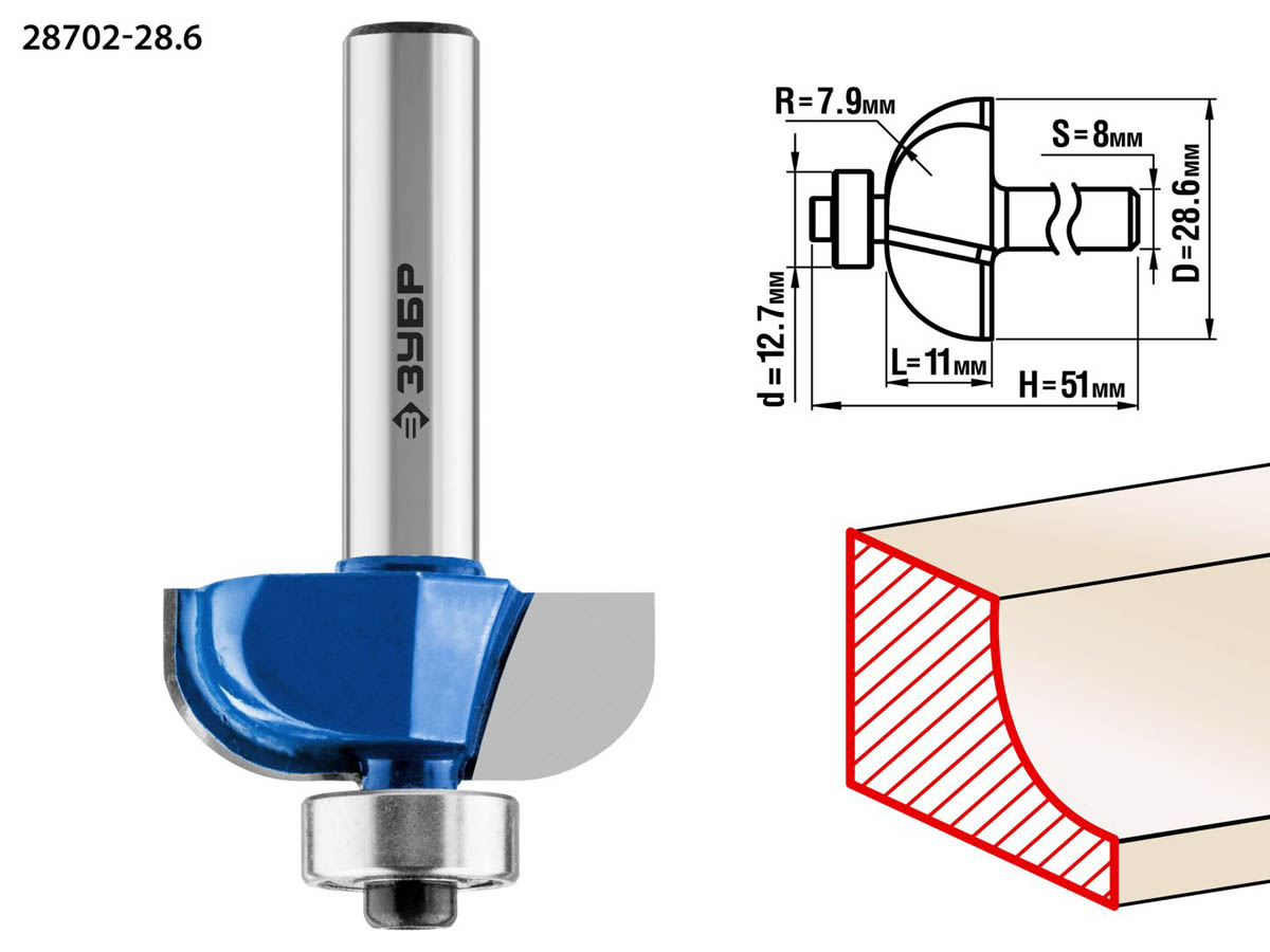 ЗУБР 28.6 x 11 мм, радиус 7.9 мм, фреза кромочная калевочная №2 28702-28.6 Профессионал