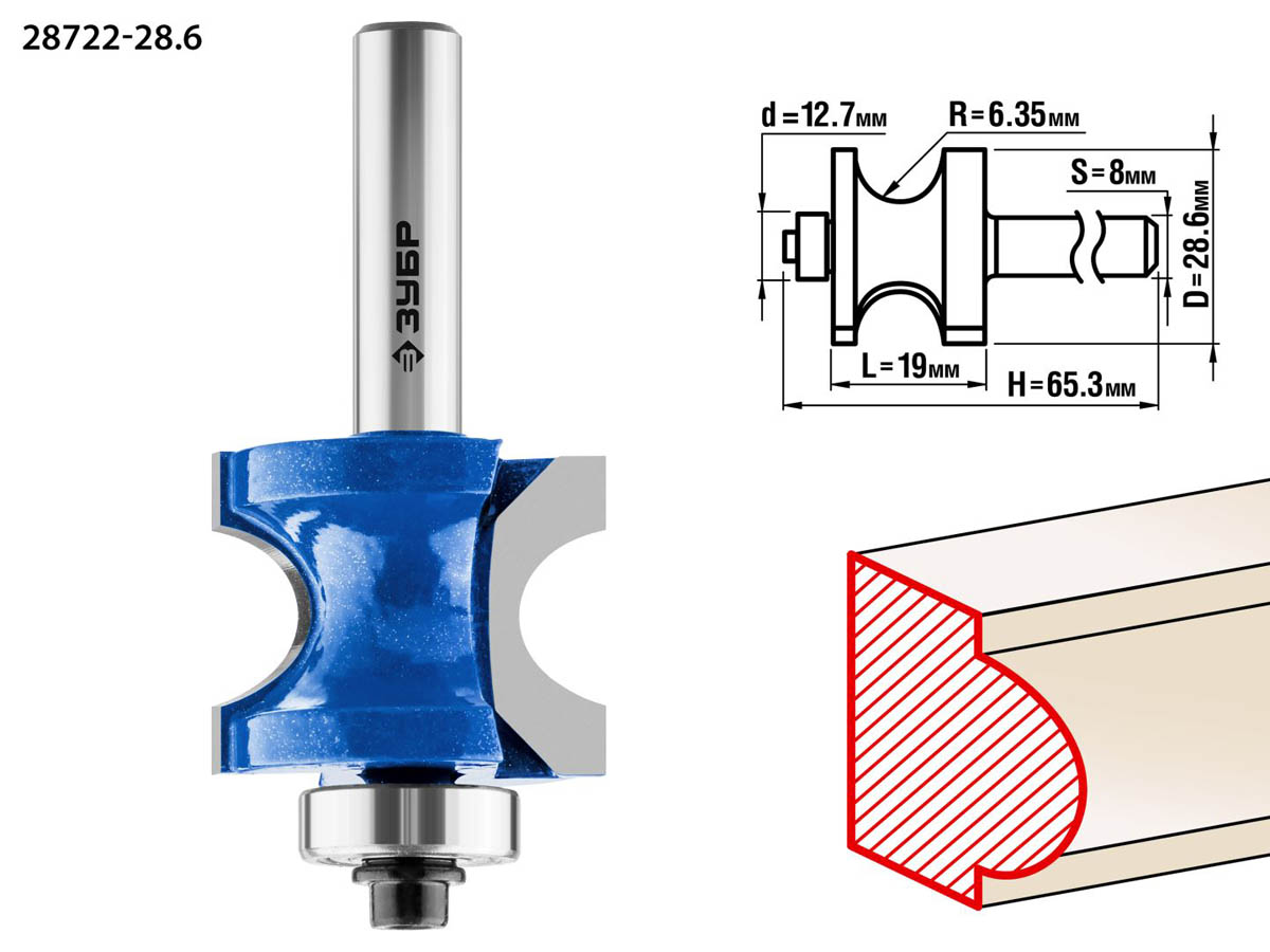 ЗУБР 28.6 x 19 мм, радиус 6.35 мм, фреза полустержневая с подшипником 28722-28.6 Профессионал