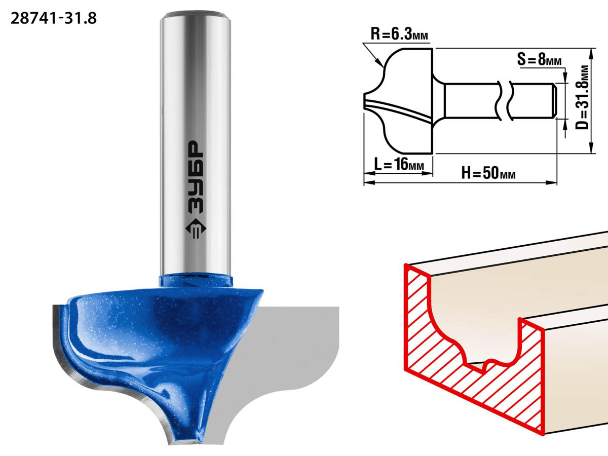 ЗУБР 31.8 x 16 мм, радиус 6.3 мм, фреза пазовая фасонная №2 28741-31.8 Профессионал