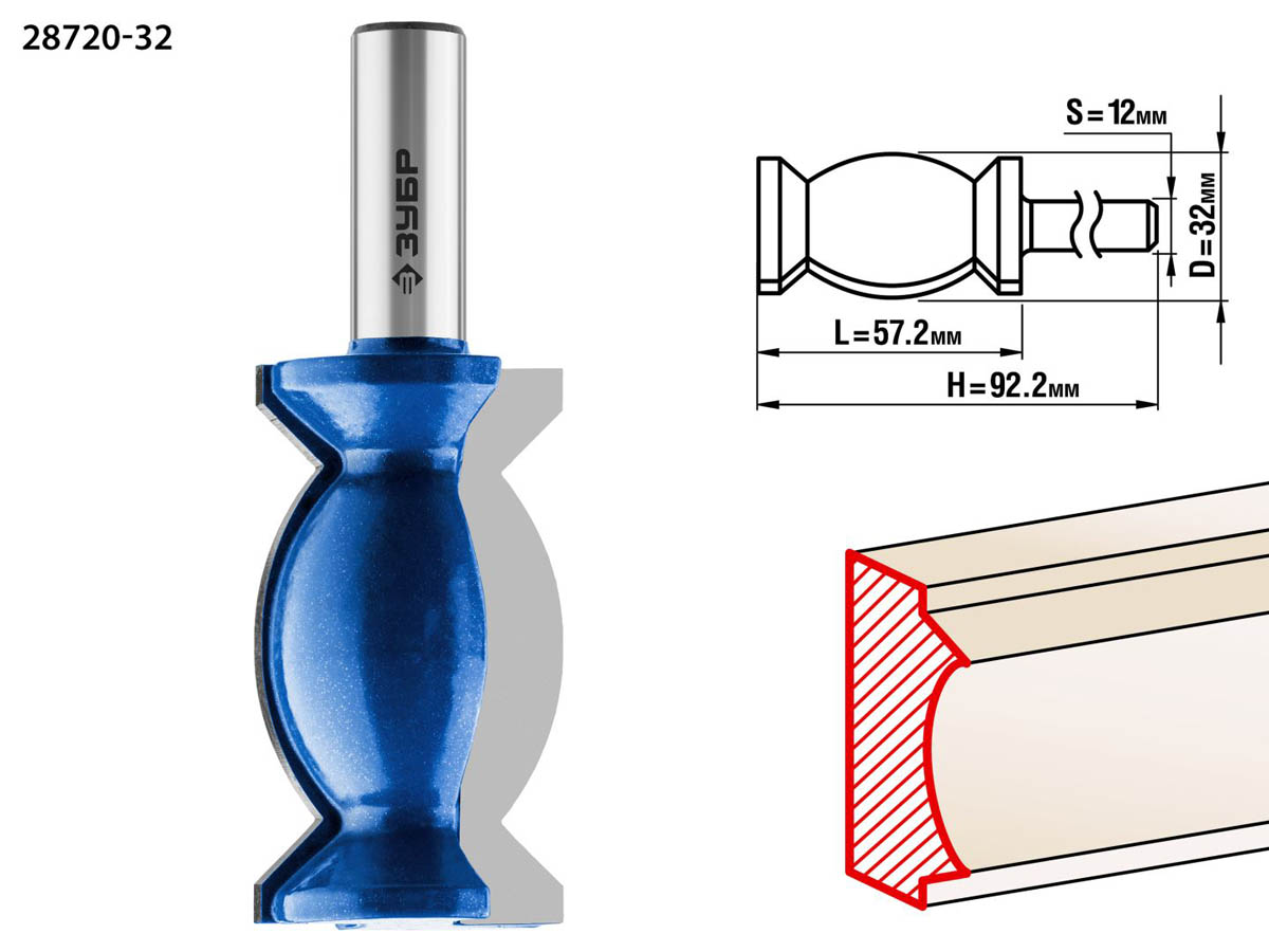 ЗУБР 32 x 57.2 мм, хвостовик 12 мм, фреза кромочная фигурная №9 28720-32 Профессионал