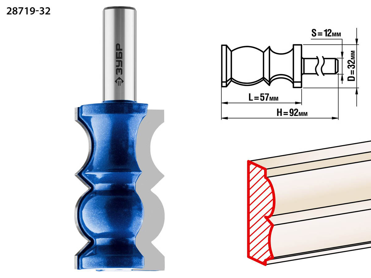 ЗУБР 32 x 57 мм, хвостовик 12 мм, фреза кромочная фигурная №8 28719-32 Профессионал