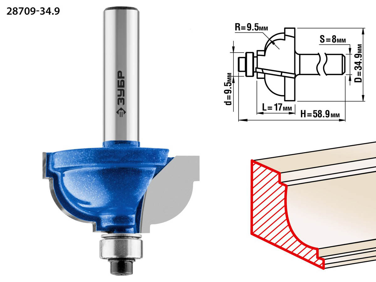 ЗУБР 34.9 x 17 мм, радиус 9.5 мм, фреза кромочная калевочная №7 28709-34.9 Профессионал