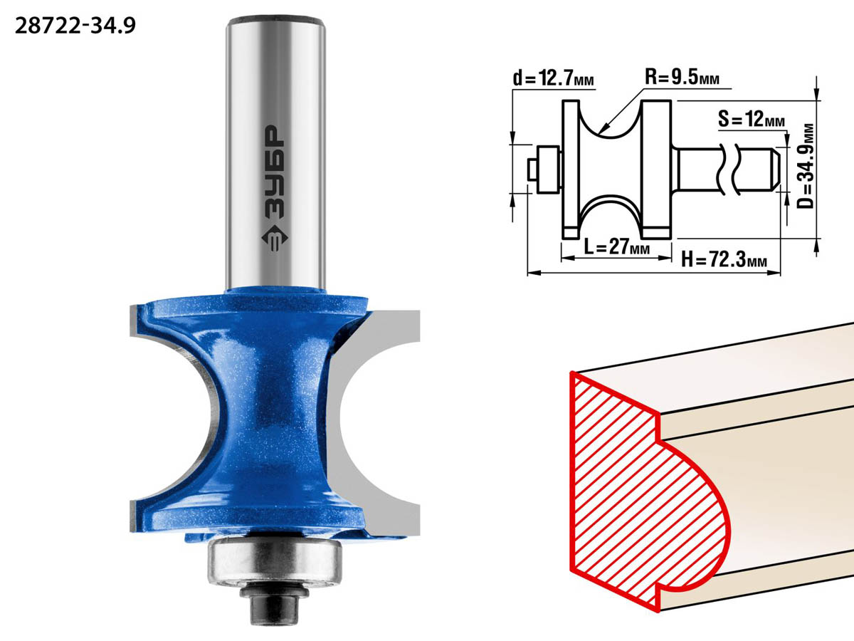 ЗУБР 34.9 x 27 мм, радиус 9.5 мм, фреза полустержневая с подшипником 28722-34.9 Профессионал