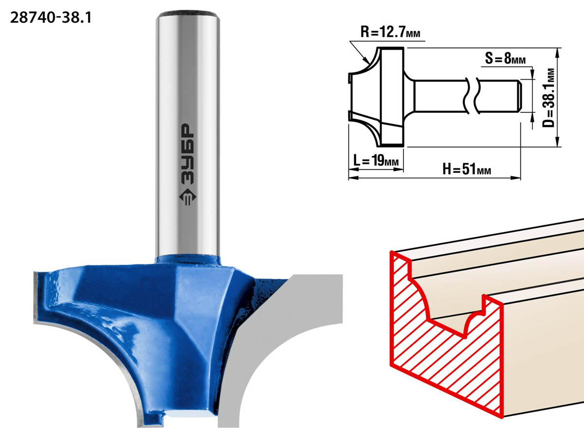 ЗУБР 38.1 x 19 мм, радиус 12.7 мм, фреза пазовая фасонная №1 28740-38.1 Профессионал