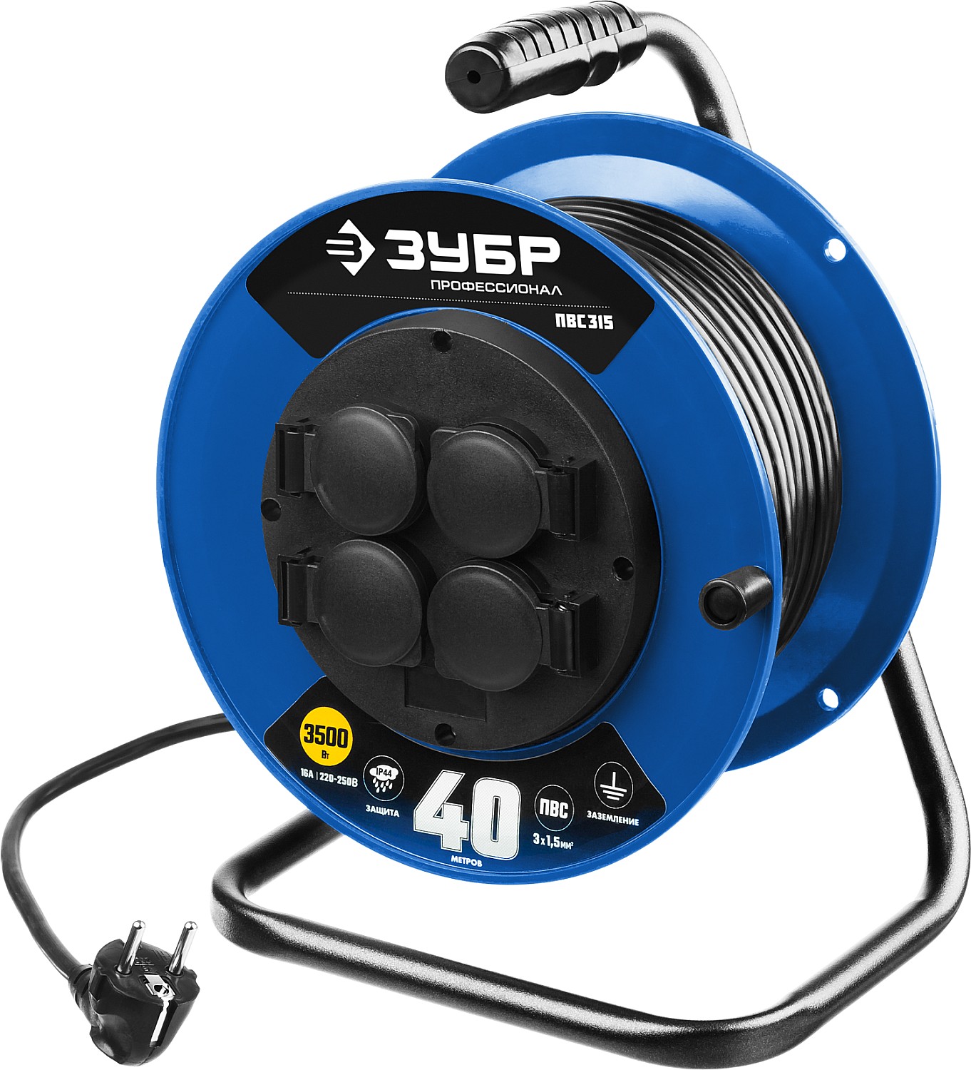 ЗУБР 40 м, 3500Вт, 4 гнезда, ПВС, удлинитель на катушке 55081-40 Профессионал