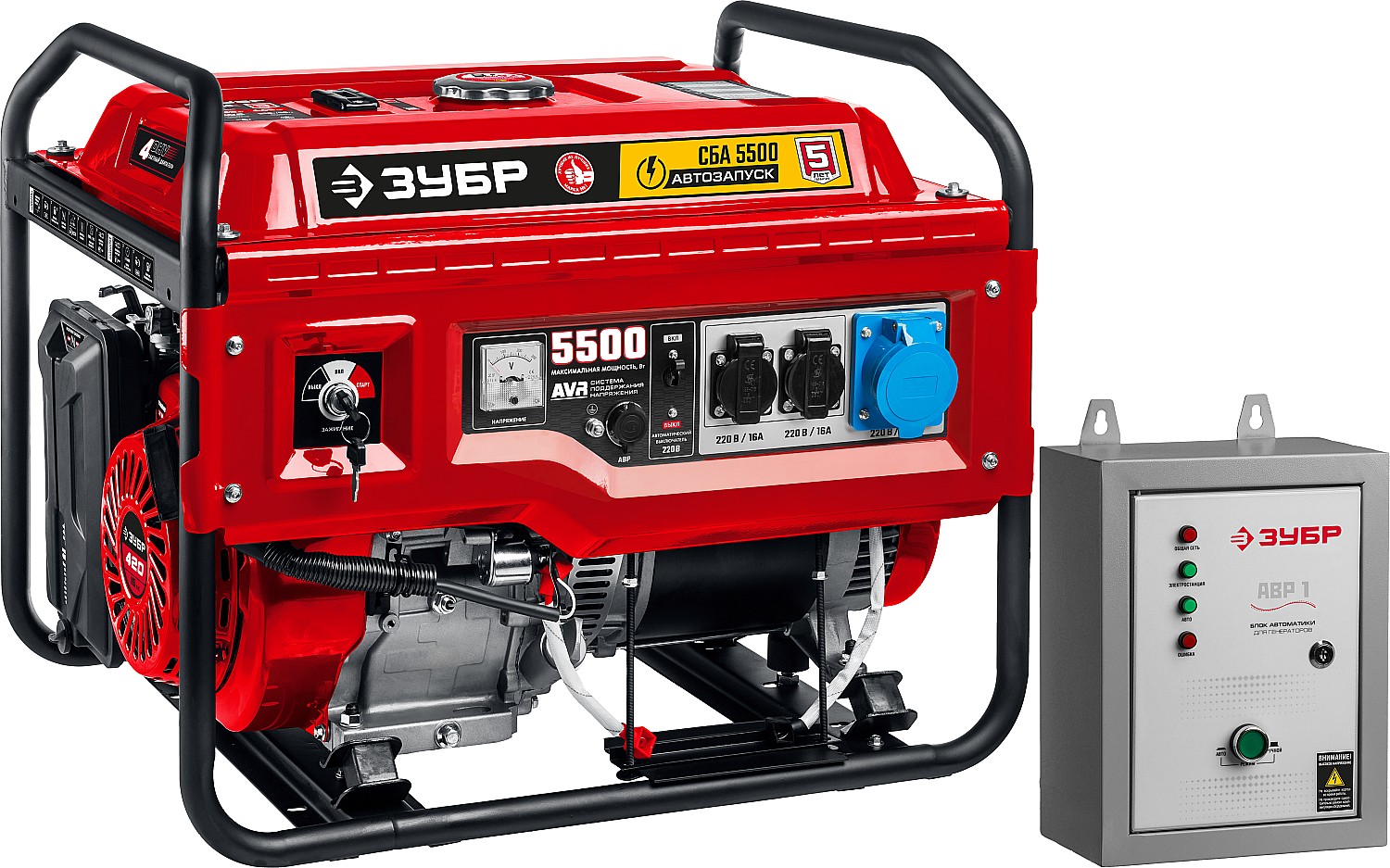 ЗУБР 5.5 кВт, однофазный, синхронный, щеточный, с автозапуском, бензиновый генератор СБА-5500 Мастер