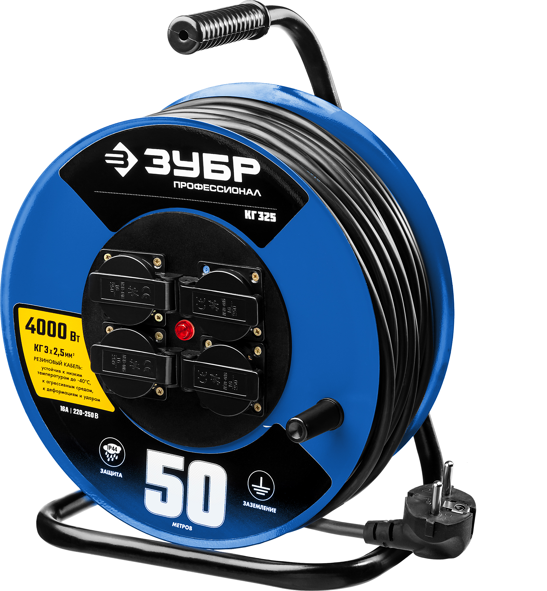 ЗУБР 50 м, 4000Вт, 4 гнезда, КГ, удлинитель на катушке 55079-50 Профессионал