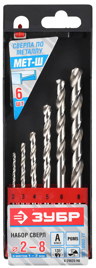 ЗУБР 6 шт. (Ø 2-8 мм), Р6М5, спираль шлифованная У-образная набор сверл по металлу 4-29625-H6