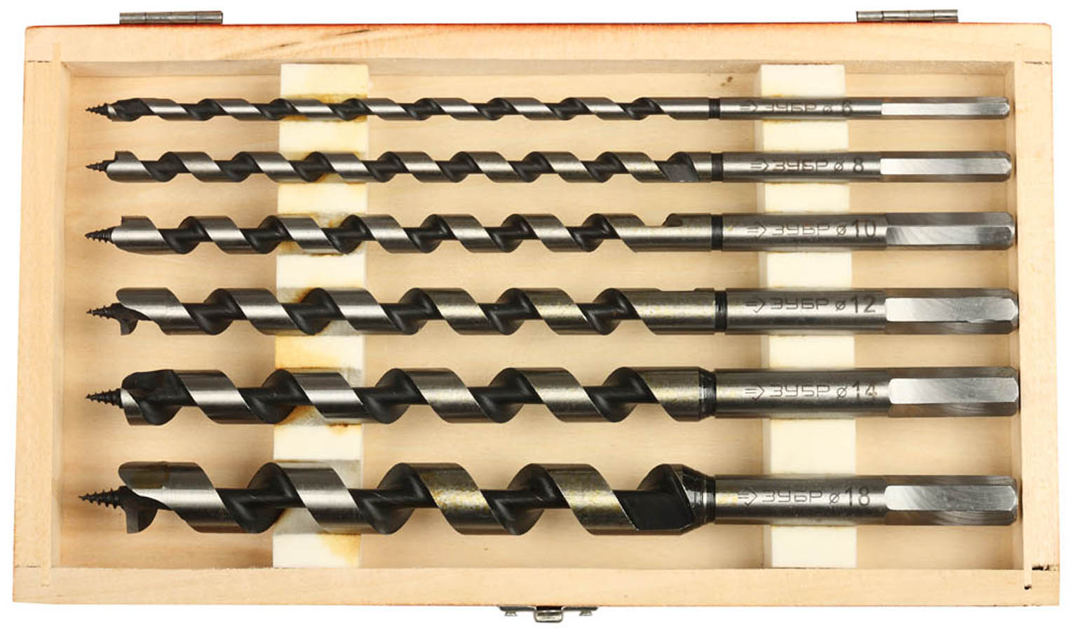 ЗУБР 6 шт., Ø 6-8-10-12-14-18 мм, спираль левиса, шестигранный хвостовик, набор сверл по дереву 2948-235-H6 Эксперт