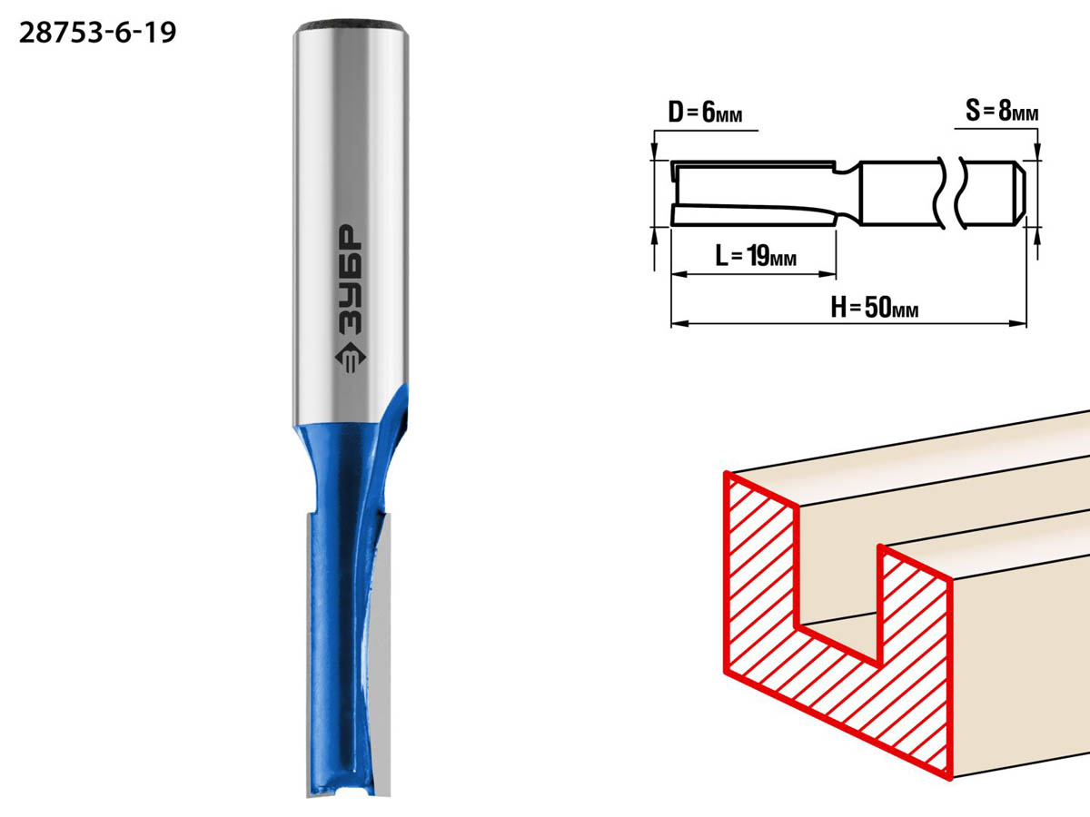 ЗУБР 6 x 19 мм, хвостовик 8 мм, фреза пазовая прямая 28753-6-19 Профессионал