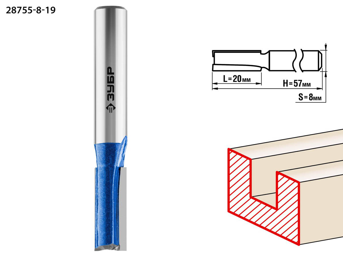 ЗУБР 8 x 20 мм, хвостовик 8 мм, фреза пазовая прямая с нижними подрезателями 28755-8-19 Профессионал