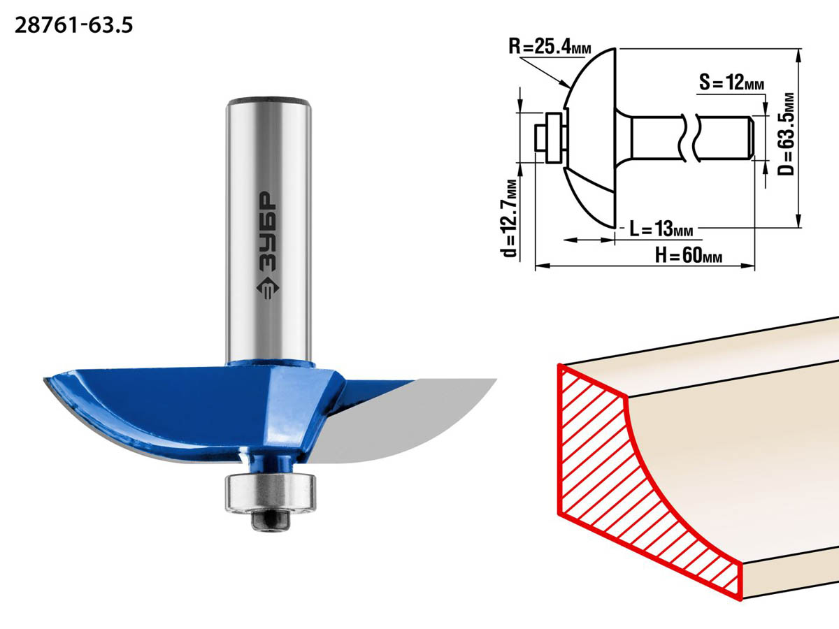 ЗУБР D=63,5 мм, рабочая длина-13 мм, радиус-25,4 мм, хв.-12 мм, d-12,7 мм, фреза фигирейная №2, 28761-63.5
