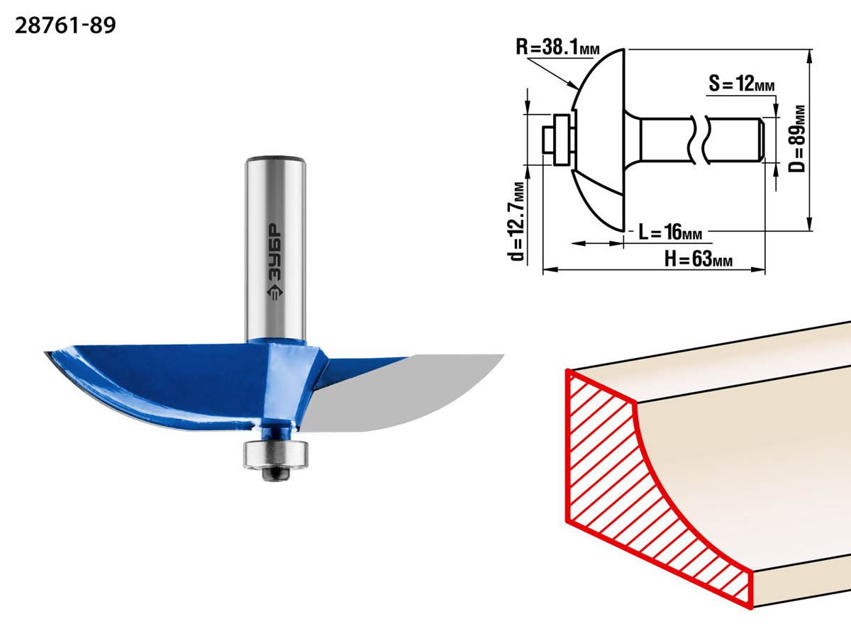 ЗУБР D=89 мм, рабочая длина-16 мм, радиус-38,1 мм, хв.-12 мм, d-12,7 мм, фреза фигирейная №2, 28761-89