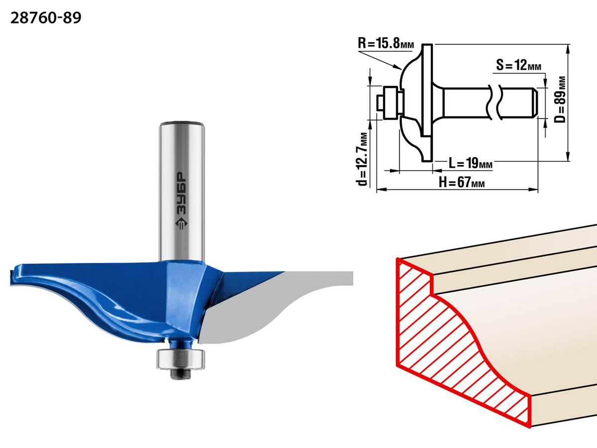 ЗУБР D=89 мм, рабочая длина-19 мм, радиус-15,8 мм, хв.-12 мм, d-12,7 мм, фреза фигирейная №1, 28760-89